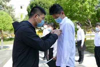 在嘹亮的国歌声中,入团仪式正式开始。主持人介绍了举行入团仪式的重要意义,并宣读新发展共青团员名单。董磊为新发展的共青团员佩戴团徽,孙翌带领全体团员在团旗下进行庄严宣誓。