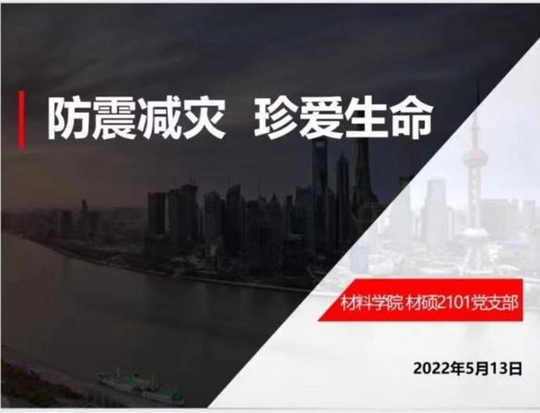 2022年5月12日,汶川地震14周年,为传承和弘扬伟大抗震救灾精神,缅怀逝者,增强支部成员的防震减灾知识储备,5月13日下午,材料学院硕士2101党支部在线上开展了以“防震减灾,珍爱生命”为主题的党日活动,支部全体成员参与此次活动。
