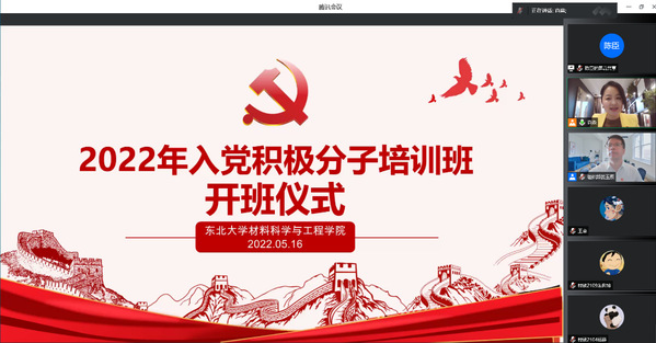 为扎实推进材料科学与工程学院发展党员工作高质量发展,进一步加强对入党积极分子的培养、教育和考察,提高入党积极分子的理论修养,严格把好党员发展“入口关”和“质量关”,5月16日晚,材料学院党委党校于线上举办2022年积极分子培训班开班仪式,东北大学党委组织部副部长姜玉原、材料学院党委副书记兼副院长贺翔、材料学院党委组织员商淼出席本次培训,材料学院262名积极分子参加培训。