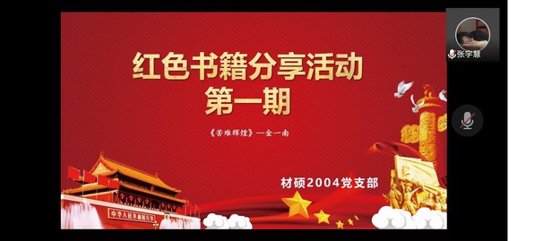 为深入推进党史学习教育,使支部成员在交流学习中坚定历史自信,巩固党史学习成果,5月15日晚,材料学院硕士2004党支部于线上开展以“筑牢思想根基,补足精神之钙”为主题的第一期红色书籍分享会活动,支部全体成员参加此次活动。