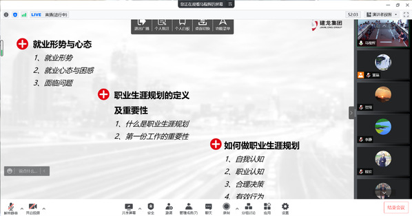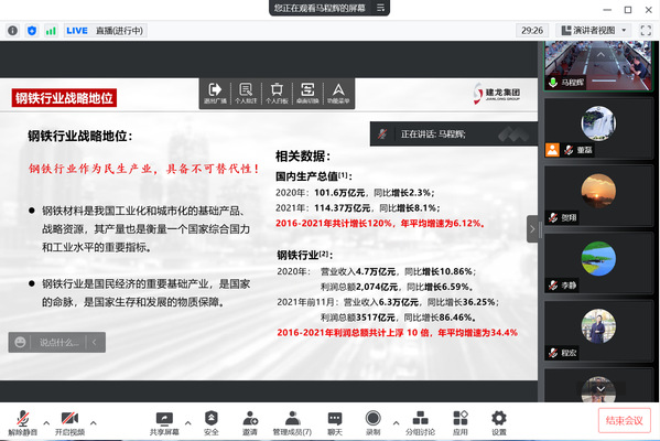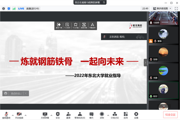 5月20日下午,东北大学NEU职涯云课通过腾讯会议直播方式举办,建龙集团人力资源部部长万海波应邀做题为“炼就钢筋铁骨 一起向未来”的报告。报告会由东北大学学生指导服务中心主办、材料科学与工程学院承办。学生指导服务中心副主任程宏,材料学院党委副书记兼副院长贺翔,毕业生就业指导授课教师,材料学院研二、研三同学线上参会。