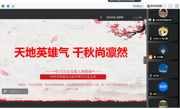 为增进支部成员对历史英雄人物事迹的了解,鼓励同学们继承与发扬英雄楷模的爱国奋斗精神,5月22日晚,材料学院腐蚀与防护中心硕士生党支部通过线上会议方式开展了以“天地英雄气,千秋尚凛然”为主题的党日活动,支部全体成员参加此次活动。