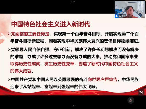 本次培训由商淼主持。培训开始,周莉按照时间顺序分别从革命时期、新中国建设时期、改革开放时期和新时代这四个时期为同学们详细的梳理了中国共产党的指导思想的基本脉络和演变路径。随后,她又从浙江嘉兴的一只小小红船,到如今的百年大党;从党的指导思想第一次历史性飞跃——毛泽东思想,到党的指导思想一脉相承——中国特色社会主义理论体系,为同学们阐述了中国共产党的指导思想的丰富内涵和历史经验。最后,商淼作出总结并表示,希望广大青年要肩负历史使命,坚定前进信心,立大志、明大德、成大才、担大任,努力成为堪当民族复兴重任的时代新人,让青春在为祖国、为民族、为人民、为人类的不懈奋斗中绽放绚丽之花。