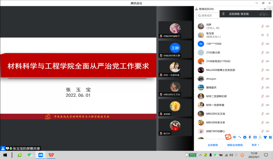 6月1日下午,材料学院召开2022年全面从严治党工作视频会议。学院领导班子成员、党委委员、纪委委员、师生党支部书记和纪检委员90余人参加会议,党委书记张玉宝主持会议。