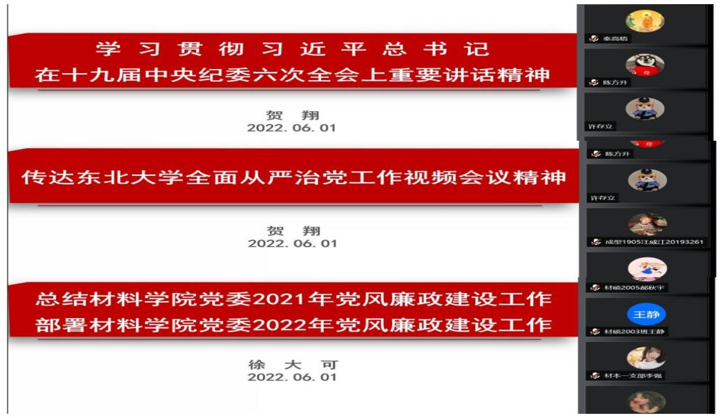 会上,学院党委副书记兼副院长贺翔传达了习近平总书记在十九届中央纪委六次全会上的重要讲话精神和东北大学2022年全面从严治党工作视频会议精神。学院党委副书记、纪委书记徐大可在总结学院党委2021年党风廉政建设工作情况的基础上,从持续强化政治监督、做实做细日常监督、坚持一体推进“三不”和加强纪检干部队伍建设等方面对学院党委2022年党风廉政建设工作计划进行详细解读。