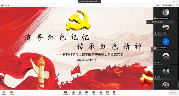 为了回顾中国共产党百年奋斗历程,学习中国共产党人的精神谱系,赓续红色精神血脉,5月28日中午,材料学院硕士2003党支部于线上开展了以“找寻红色过去,弘扬红色精神”为主题的党日活动,支部全体成员参加此次活动。