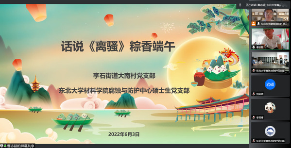 粽叶香飘,艾蒲青翠,端午节是中国首个入选世界非物质文化遗产的传统节日。为进一步弘扬中华优秀传统文化及爱国主义精神,6月3日上午,材料学院腐蚀与防护中心研究生党支部联合沈抚示范区李石街道大南村党支部通过线上视频会议方式联合开展了以“话说《离骚》,粽香端午”为主题的党日活动,材料学院教学科研办副主任、沈抚示范区李石街道大南村驻村第一书记曹志超,材料学院党委副书记、纪委书记徐大可,大南村全体党员和材料学院腐蚀与防护中心硕士生党支部全体成员参与本次活动。