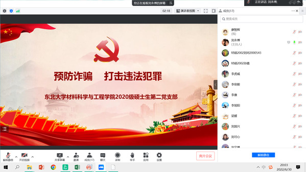 为进一步提高党支部成员对电信诈骗的识别和防范能力,有效遏制电信诈骗的发生,6月30日晚,材料学院硕士2002党支部开展以“预防诈骗,打击违法犯罪”为主题的线上党日活动,党支部全体成员参加本次活动。