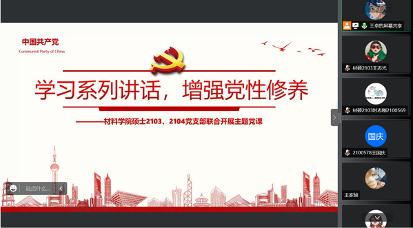 为使支部成员深入学习习近平总书记系列讲话精神,进一步激发支部成员作为新一代青年的责任感和使命感,7月19日晚,材料学院硕士2103、2104党支部联合于线上开展了以“学习系列讲话,增强党性修养”为主题的党课,支部全体成员参加。