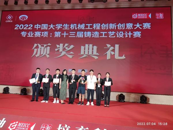 第十三届中国大学生铸造工艺设计大赛由中国机械工程学会主办,中国机械工程学会铸造分会、装备制造业关键零部件铸造领域创新成果产业化公共服务平台承办。本届大赛共分为初评和终评两个环节,经过初评,东北大学有4支队伍入围决赛终评,经过答辩评审和知识竞赛,由材料科学与工程学院教师张雅静、赵大志指导的曹文泊、苏宸、李金典团队和杨旭东、周淅团队,材料科学与工程学院教师赵大志、张峻嘉指导的王泽坤、刘文洁、徐溶榕团队分别获得全国一等奖;材料科学与工程学院教师刘兴刚、闫述指导的史伟宏、张珮瑶、褚冉星、杨涵淞团队获得全国二等奖。