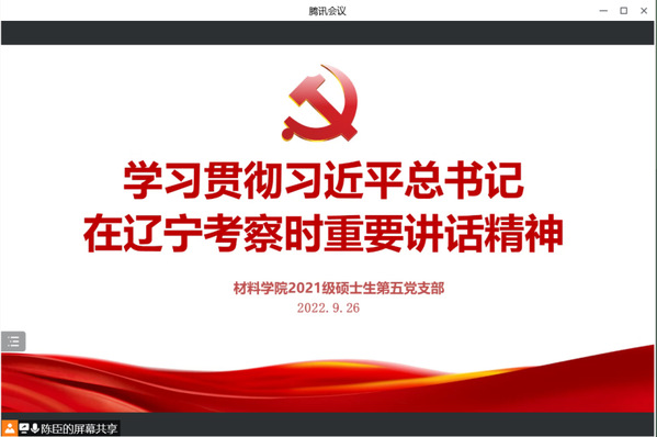 为深入贯彻落实习近平总书记在辽宁考察时重要讲话精神,引导党支部成员发扬红色传统、传承红色基因,赓续共产党人精神血脉,9月26日晚,材料学院硕士2105党支部于线上开展以“学习贯彻习近平总书记在辽宁考察时重要讲话精神”为主题的党日活动,党支部全体成员参加了此次活动。
