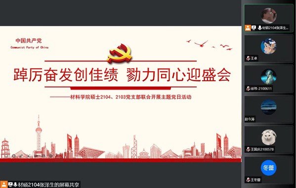 为引导同学们从百年党史的“教科书”中汲取精神滋养和奋进力量,学习习近平总书记关于青年成长成才的重要论述,以实际行动迎接党的二十大胜利召开,9月26日下午,材料学院硕士2103、2104党支部于线上联合开展了以“踔厉奋发创佳绩,戮力同心迎盛会”为主题的党日活动,支部全体成员参加了此次活动。