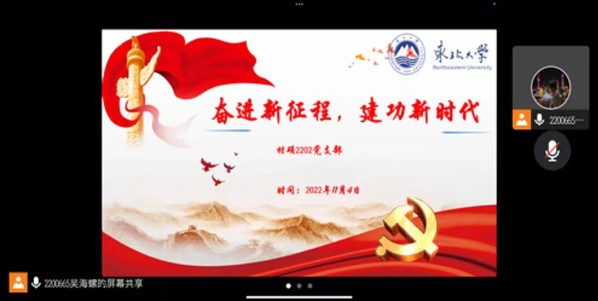 为深入学习贯彻党的二十大精神,进一步坚定同学们的理想信念,11月4日下午,材料学院硕士2202党支部于线上开展了以“奋进新征程,建功新时代”为主题的党日活动,支部全体成员参加此次活动。