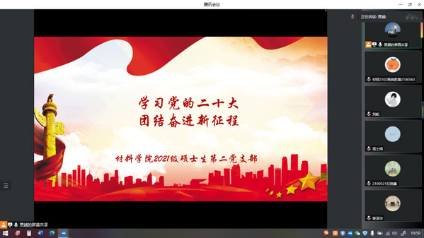 为深入学习领会党的二十大精神,提升支部成员的党性修养,树立正确的人生观价值观,11月27日上午,材料学院硕士2102党支部于线上开展了以“学习党的二十大,团结奋进新征程”为主题的党日活动,支部全体成员参加本次活动。