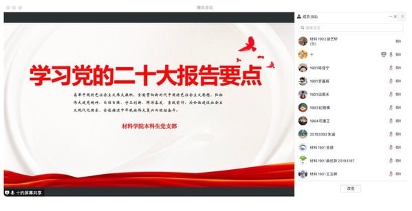 为学习贯彻党的二十大精神,引导支部成员不忘“坚定跟党走”的初心,11月26日晚,材料学院本科生党支部于线上开展以“学习党的二十大,携手奋进新征程”为主题的党日活动,支部全体成员参与本次活动。
