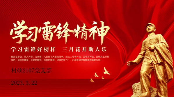 为深刻把握雷锋精神的时代内涵,进一步增强支部成员的责任意识,提高支部成员的党性修养,3月22日晚,材料学院硕士2107党支部于线下开展了以“学习雷锋好榜样,三月花开助人乐”为主题的党日活动,支部全体成员参加此次活动。