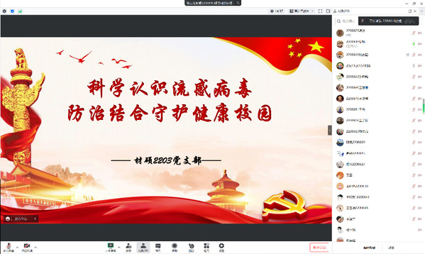 时下正值流感病毒高发季节,为帮助支部全体成员树立起对流感的正确认识,学习科学防治手段,切实维护集体成员的身体健康,3月29日晚,材料学院硕士2203党支部于线上开展了以“科学认识流感病毒,防治结合守护健康校园”为主题的党日活动,支部全体成员参加此次活动。