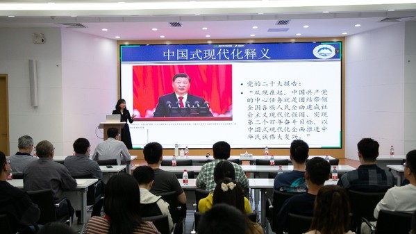 在专题报告中,李丹围绕“释义中国式现代化”和“解读高质量发展”这两方面与师生党员进行交流。在中国式现代化释义方面,李丹指出中国式现代化,是中国共产党领导的社会主义现代化,既有各国现代化的共同特征,更有基于自己国情的中国特色,包括人口规模巨大的现代化、全体人民共同富裕的现代化、物质文明和精神文明相协调的现代化、人与自然和谐共生的现代化、走和平发展道路的现代化。在高质量发展解读方面,李丹就习近平总书记在党的二十大报告中提出的“高质量发展是全面建设社会主义现代化国家的首要任务”与同学们进行交流。李丹表示,高质量发展之所以成为首要任务,是因为这是在全面认识和把握我国现代化建设实践历程以及各国现代化建设一般规律的基础上,做出的一个具有全局性、长远性和战略性意义的重大判断。