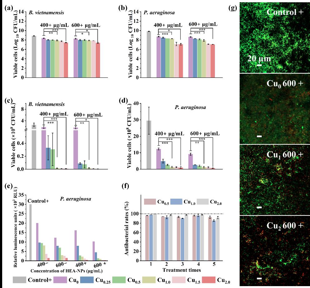 图2.光照下高熵合金纳米颗粒抗菌性能。