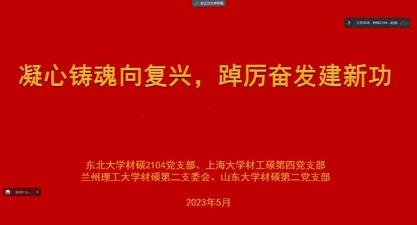 为深入开展学习贯彻习近平新时代中国特色社会主义思想主题教育,进一步提升同学们的理论素养,5月26日晚,东北大学材料科学与工程学院2021级硕士生第四党支部联合山东大学材硕第二党支部、上海大学材工硕第四党支部、兰州理工大学材硕第二支委会于大学生活动中心206开展了以“凝心铸魂向复兴,踔厉奋发建新功”为主题的党课,四个支部全体党员参与此次活动。