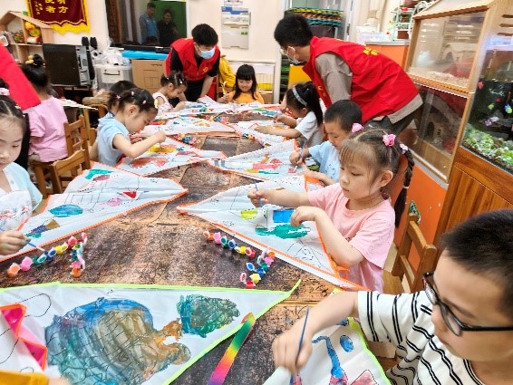 活动伊始,志愿者们来到迎湖园社区,和小朋友们一起发挥想象力在板报上绘制精美的图案和文字,向广大少年儿童致以节日的祝福,向付出辛勤劳动的教师和少儿工作者表示崇高敬意。接着,志愿者们将准备好的气球分发给在场的每一位小朋友。小朋友们的脸上洋溢着灿烂的笑容,纷纷表示喜欢这个特别的礼物。随后,志愿者们来到马路湾中心幼儿园,并对现场进行布置,为小朋友们准备了各色颜料以及风筝。最后,在志愿者以及老师的指导下,小朋友们手握画笔,发挥想象力,将各种“红色”标志在风筝上描绘呈现。通过志愿者与小朋友们同绘风筝,以DIY绘画方式,向小朋友们传播爱党爱国教育。