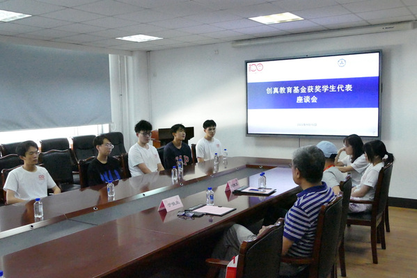 捐赠仪式后,于铁生、刘技文与教师及获资助学生代表座谈,深入了解学生情况。受助学生对天津创真金属科技有限公司的资助表达诚挚感谢,分享自己的学习生活情况。于铁生、刘技文寄语学生在学习和工作中脚踏实地,久久为功。