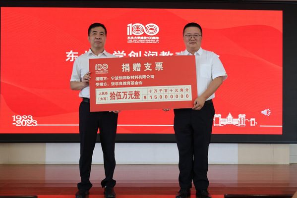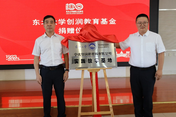 值此东北大学建校100周年之际,宁波创润新材料有限公司向学校捐资15万元用于设立创润教育基金,全部资金用于奖助学金。吴景晖和张玉宝代表企业和学校举行捐赠,并为东北大学-宁波创润新材料有限公司实践教学基地揭牌。王玉琦为吴景晖颁发捐赠证书。