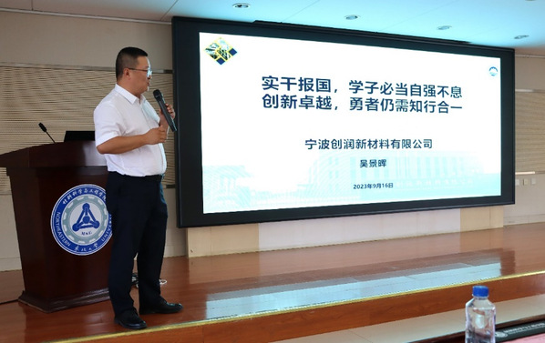 仪式后,吴景晖作“实干报国,学子必当自强不息;创新卓越,勇者仍需知行合一”主题报告。吴景晖以自身成长经历出发,强调了知识的重要性,分析了中国高纯金属制备的行业现状,介绍了宁波创润新材料有限公司的发展历史,鼓励同学们进入高精尖制造业实习并丰富学识。吴景晖表示,东北大学拥有百年光荣传统,身为新时代的东大人,应当确立目标,坚定信念,努力奋斗,在一流大学建设征程上迈出更加坚强有力的步伐,奉献东大学子的赤诚之心。