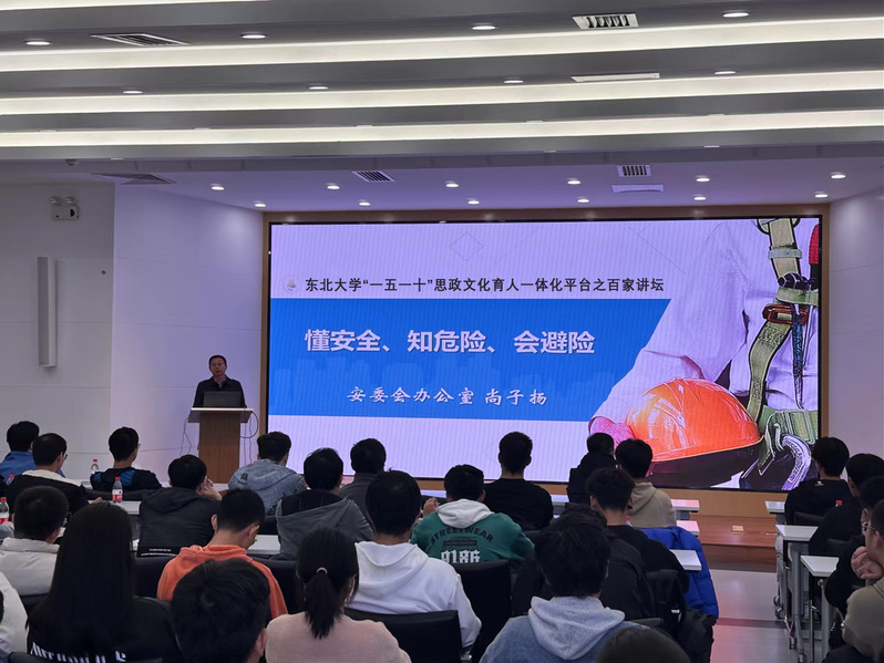 2023年10月18日,东北大学材料学院于RAL560报告厅成功举行“一五一十”思政文化育人一体化平台之“名家讲坛”报告会。本次报告会邀请了东北大学安全管理委员会办公室主任尚子扬担任主讲人。材料学院党委副书记兼副院长贺翔、材料学院学生工作办公室主任孙巍巍以及材料学院2023级本科生辅导员金煜出席会议,材料学院2023级研究生和本科生主要学生干部参会。会议由孙巍巍主持。