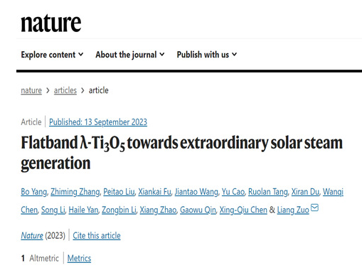左良团队通过理论解析、实验研究和模拟计算,发现了具有平带电子结构和低导热系数的金属性λ-Ti3O5光热转换材料。实现了全太阳光谱范围内对光的本征强吸收、低反射,且将光热转换和光生热量限域于材料表层区域。利用λ-Ti3O5作为吸光体,制备出了内部通孔和顶部空腔结构的水凝胶基三维蒸发器,创造了太阳光驱动海水淡化蒸发速率的世界纪录。该材料技术不仅在海水淡化领域拥有巨大应用前景,而且可以拓展到污水处理等领域。该成果于2023年9月在《自然》发表,并被Science China Materials、Joule等国际著名期刊专评。