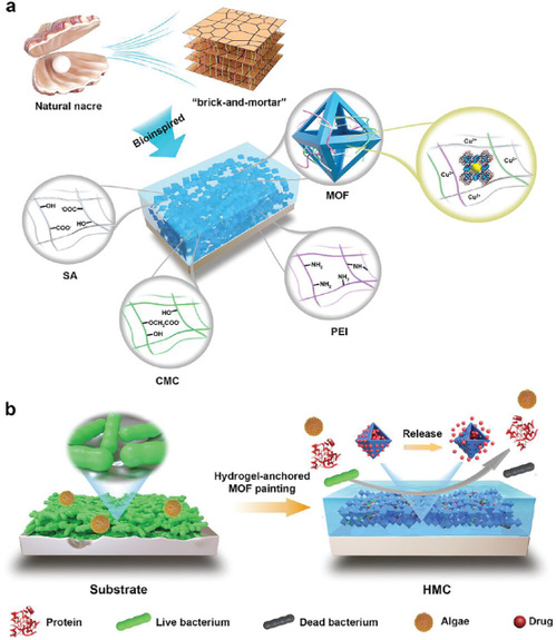 近日,东北大学的徐大可课题组受珍珠母内无定形/结晶特征的启发,开发了一种由生物聚合物基水凝胶和致密金属有机骨架(MOFs)组成的机械坚固防污涂层。跨多尺度界面定制交联网络可以提供强度、消散应变并提高构建块的韧性,从而在各种基板上实现牢固且可扩展的配置,无论材料类别和表面拓扑如何。所得涂层作为合适的储层表现出独特的智能MOF降解或药物释放的主动防御行为,为广谱生物污染和腐蚀控制提供了突破性的性能。值得注意的是,在复杂的生物环境中进行长时间的测试过程中,既没有观察到海洋生物的附着,也没有观察到金属基质的MIC。本研究为综合防污腐蚀的潜在多机理提供了独特的见解,并开创了在海洋环境中设计下一代可靠MOFs衍生涂料的合理策略。该研究工作以题为“Nacre-Inspired Metal-Organic Framework Coatings Reinforced by Multiscale Hierarchical Cross-linking for Integrated Antifouling and Anti-Microbial Corrosion”的论文发表在国际顶级期刊《Advanced Functional Materials》上。