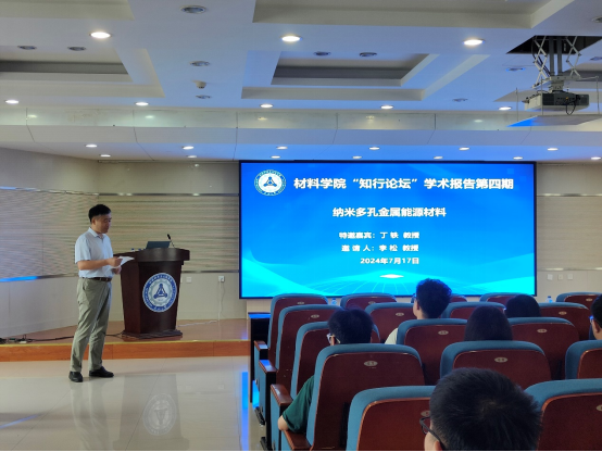 7月17日,东北大学材料科学与工程学院在知行楼634室举办“知行论坛”第四期学术讲座,应材料学院李松教授邀请,天津理工大学丁轶教授应邀作“纳米多孔金属能源材料”学术报告,报告会由李松教授主持,材料学院院长王建军、副院长杨波等50余名师生参加。