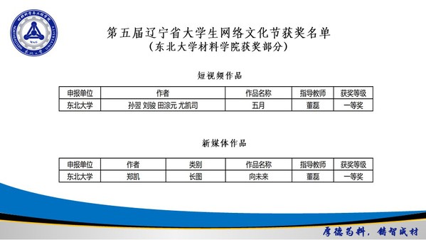 近日,由中共辽宁省委教育工委、辽宁省教育厅举办的第五届辽宁省大学生网络文化节和全省高校网络教育优秀作品推选展示活动结果公布。由学院团委申报,由董磊指导孙翌、刘骏、田淙元、尤凯司完成的短视频作品《五月》和郑凯完成的新媒体作品《向未来》获得一等奖。