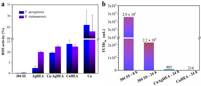 图2 高熵合金与微生物共培养后ROS产量(a)及对新冠肺炎病毒抗性(b)