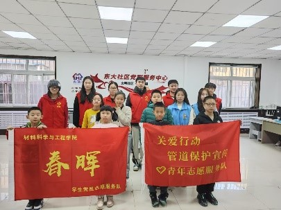 为提升儿童“不伤害管道、不被管道伤害”的管道保护意识和自我防护能力,筑牢油气管道安全“人民防线”,10月以来,材料科学与工程学院春晖学生党员志愿服务队在东大社区、铁五小学二分校、和平大街第二小学开展了一系列“少年儿童安全守护计划”管道保护宣传志愿服务活动,辐射人数约二百余人次。春晖学生党员志愿者近百人参加活动。