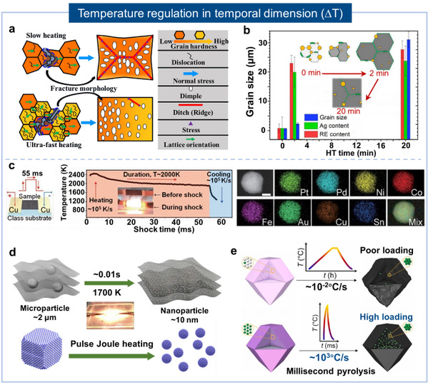 如图2所示,利用温度实现远离平衡加工的关键在于在时间和/或空间维度上施加显著的温度梯度,从而实现自由能的陡峭梯度。遵循这一原则,人们成功开发了各种加工策略,如合金的超快热处理获得软硬双相组织、瞬热制备高熵合金纳米颗粒材料等。