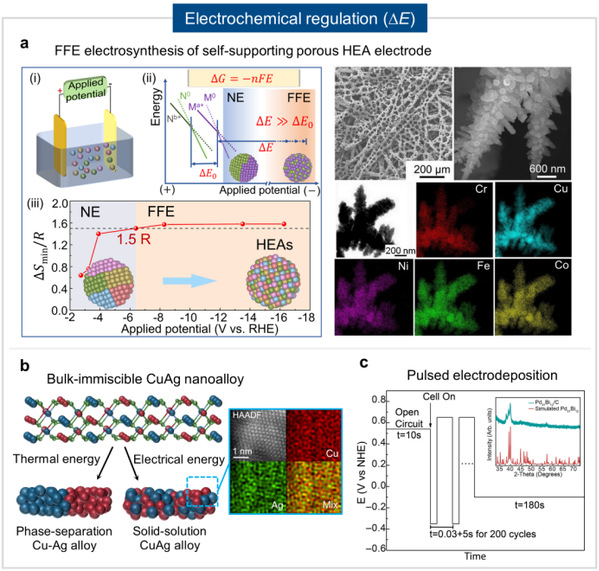 图4展示了电化学过程在制备通过热化学方法难以获得的亚稳材料方面的能力,以及通过调节电极电位来创造FFE环境,从而合成具有均匀元素分布的高熵合金和固溶纳米合金。