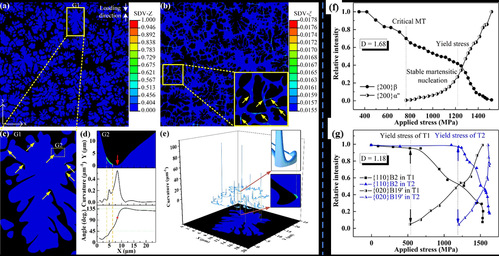 图1 (a-e) 有限元模拟揭示分形结构诱发的稳定马氏体形核机制;(f-g) 原位衍射实验表征不同分形维度(D)复合材料中形变诱发相变转变特征,揭示分形维度对马氏体相变动力学影响。