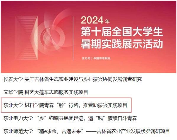近日,由中国青年报社主办的第十届全国大学生暑期实践展示活动案例评选结果揭晓,材料学院青春“黔”行路,推普助振兴实践项目入选全国大学生暑期实践项目案例。