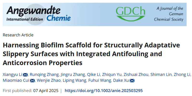 近日,材料学院王福会教授团队徐大可教授课题组在海洋防污防腐涂层领域取得突破进展,相关成果“Harnessing Biofilm Scaffold for Structurally Adaptative Slippery Surfaces with Integrated Antifouling and Anti-Corrosion Properties”发表于化学材料学科国际顶级期刊Angewandte Chemie(IF=16.1, DOI:10.1002/anie.202503295)。材料学院李祥宇特聘研究员和硕士生张润晴为共同第一作者,徐大可教授、李祥宇特聘研究员、崔苗苗副教授为共同通讯作者,东北大学为第一完成单位和唯一通讯单位。