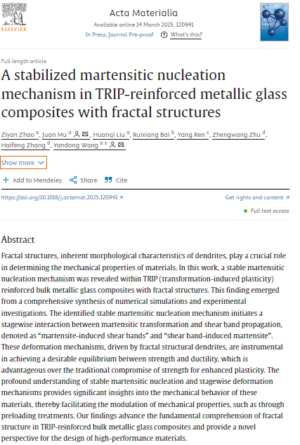 3月14日,东北大学材料科学与工程学院牟娟教授、王沿东教授课题组在国际材料顶级学术期刊《Acta Materialia》在线发表题为A stabilizedmartensitic nucleation mechanism in TRIP-reinforced metallic glass composites withfractal structure的研究论文。东北大学为该文的第一完成单位,材料科学与工程学院2019级博士、现冶金学院博士后赵子彦为第一作者,材料科学与工程学院牟娟教授和王沿东教授为共同通讯作者。东北大学先进亚稳金属材料研究中心、大连理工大学、美国阿贡国家实验室以及北京科技大学新金属材料国家重点实验室为合作研究单位。