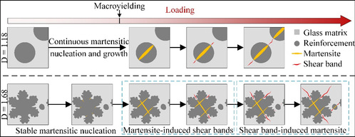 形结构具有复杂几何特征和自相似性,例如,自然界中的雪花在不同尺度下均呈现相似的微观形态,即无论放大多少倍,其细节结构始终保持与整体相似。非晶复合材料中的枝晶相同样展现出典型的分形特征。该文通过原位高能X射线衍射实验和有限元模拟分析,首次揭示了具有分形结构特征的TRIP强化非晶复合材料在形变诱发马氏体相变过程中呈现的独特的稳定形核机制。在弹塑性变形阶段,即非晶基体处于弹性变形而晶态相发生塑性变形的过程中,马氏体相变优先在曲率较高、曲率半径与加载轴约呈45°的位置形核,并在几何约束作用下长大受限。随着应变的增加,由分形结构诱发的稳定马氏形核机制导致了“马氏体诱发剪切带”和“剪切带诱发马氏体”的分阶段交互作用。在前塑性阶段,变形机制主要由“马氏体诱发剪切带”主导,低体积分数的剪切带与马氏体以及二者的均匀分布特征,导致其具有较高的屈服应力。而在后塑性阶段,“剪切带诱发马氏体”机制占主导地位,多尺度的枝晶尺寸与枝晶间距促使该过程逐级进行,从而有效延长TRIP效应。这些由分形枝晶主导的变形机制有效突破了传统TRIP强化非晶复合材料中以牺牲强度来提升塑性的局限性。