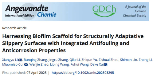 近日,材料学院王福会教授团队徐大可教授课题组在海洋防污防腐涂层领域取得突破进展,相关成果“Harnessing Biofilm Scaffold for Structurally Adaptative Slippery Surfaces with Integrated Antifouling and Anti-Corrosion Properties”发表于化学材料学科国际顶级期刊Angewandte Chemie(IF=16.1, DOI:10.1002/anie.202503295)。材料学院李祥宇特聘研究员和硕士生张润晴为共同第一作者,徐大可教授、李祥宇特聘研究员、崔苗苗副教授为共同通讯作者,东北大学为第一完成单位和唯一通讯单位。