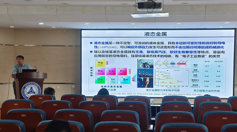尚杰研究员以“导电材料弹性化的挑战”这一关键问题为切入点,引出“高导电率与高拉伸性不兼容”,“拉伸形变下导电的稳定性问题”的研究现状,重点介绍了柔弹性力敏材料与传感器的研发历程,从耐高温到耐腐蚀全面阐述了镓基液态金属固态多样性的巨大潜力并介绍了诸多后续的应用方向。同时介绍了报告人团队实现镓基液态金属超薄膜从纳米级到微米级线宽的液态金属图案化,发展液态金属超声喷印技术,解决了液态金属粘度大导致难以喷印的问题,以及弹性双模态应变传感器与弹性数字化压力传感器的研究进展。