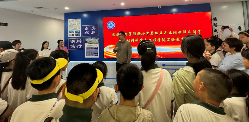 5月27日上午,望湖路小学总校五年五班走进东北大学“新材料改变世界”科普基地开展“探秘材料世界·点燃科学梦想”主题研学活动。材料学院副院长潘虎成教授、牟娟教授、闫海乐副教授、实验中心赵卓高级工程师以及五年五班师生及家长参加活动。