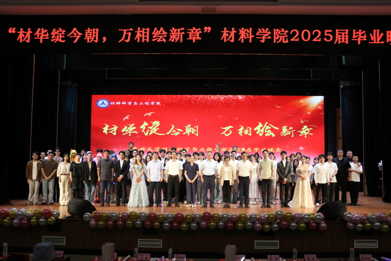 晚会以“材华绽今朝,万相绘新章”为题,分“追梦逐路远”“受业承师恩”“风雨送新程”三个篇章进行,展现了2025届材料学子奋发向上的青春姿态。最后,晚会在全场大合唱材料学院2025届毕业主题歌《少年从不等风来》中落下帷幕。