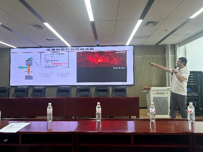 卢晋研究员围绕“单分子定位超分辨成像技术”这一核心问题,介绍了其团队搭建的可同时获取多模态信息的单分子荧光成像系统。该系统能精确提取单分子的空间定位与三维取向等关键参数,并成功应用于磷脂膜微环境的超分辨解析研究。在此基础上,他创新性地提出荧光分子在电化学体系中的受限扩散机制,实现了单分子电化学成像,并将该机制扩展至细胞中的电子传递过程,实现了微生物胞外电子传递的高分辨率成像。