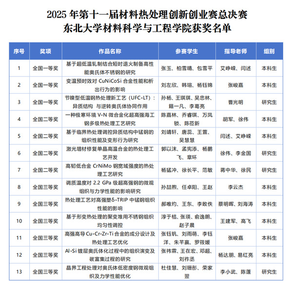 近日,2025年中国大学生机械工程创新创意大赛——第十一届材料热处理创新创业赛总决赛在西安理工大学金花校区落下帷幕。本次大赛由中国机械工程学会主办,中国机械工程学会热处理分会和西安理工大学联合承办,东北大学材料学院共有13件作品晋级全国总决赛,荣获全国一等奖3项、二等奖4项、三等奖6项。东北大学入围全国总决赛的队伍全部获奖。
