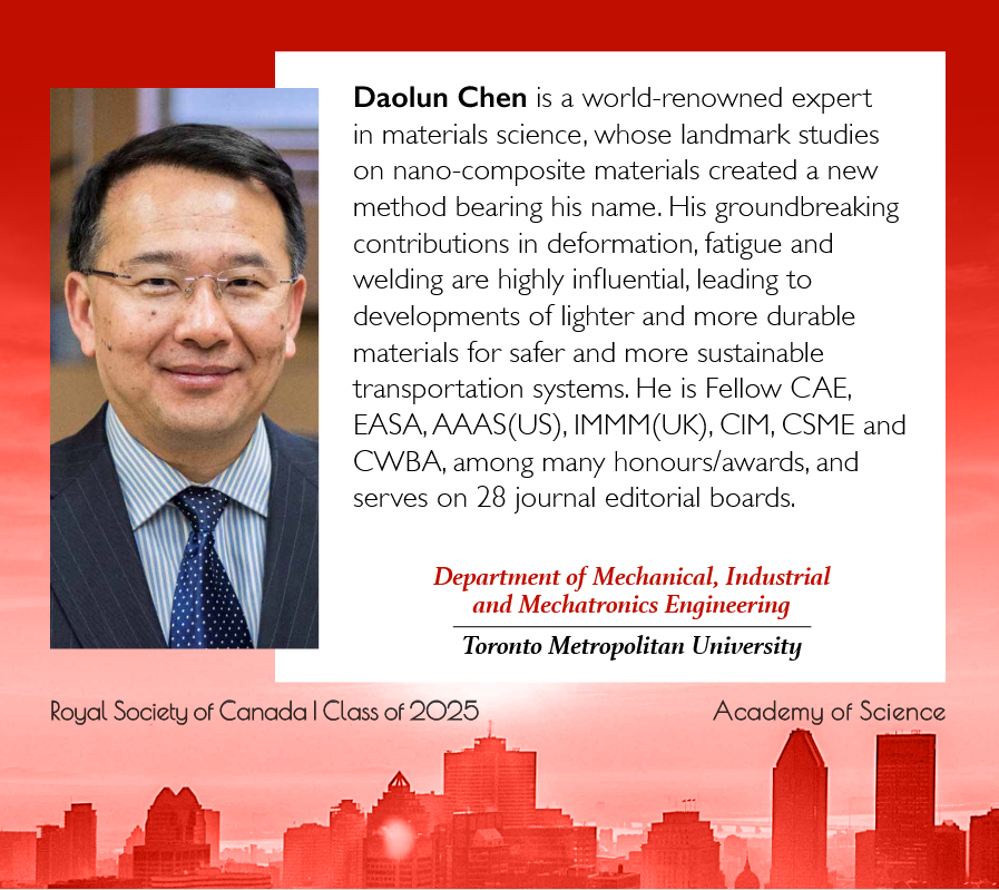 当地时间9月4日,加拿大皇家学会(The Royal Society of Canada)公布了2025年新增院士名单,东北大学材料科学与工程学院1979级校友、多伦多都会大学(Toronto Metropolitan University)教授陈道伦校友当选加拿大皇家科学院院士(The Academy of Science of the Royal Society of Canada)。