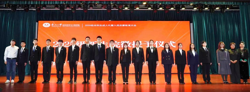 在院徽授予仪式上,学院党委副书记兼副院长黄晓颖、学院党委组织员商淼、学院团委书记兼中外合作办学专业辅导员董磊、学院学生工作办公室副主任兼2024级材料类专业辅导员王铂钧共同为2025级各班新生代表佩戴上学院院徽。这枚小小的院徽,不仅是身份的象征,更是荣誉、归属与责任的传递,标志着新生们正式成为“东大材料人”大家庭的一员。随后,全场迎来了庄严的成人礼宣誓环节。在新生代表的领誓下,全体2025级新生高举右拳,许下了“立志成为有理想、有担当、有文化、堪当大任的时代新人……为实现中华民族伟大复兴而不懈奋斗!”的青春誓言。铿锵有力的誓言在会场回荡,彰显了新一代材料学子的昂扬斗志。